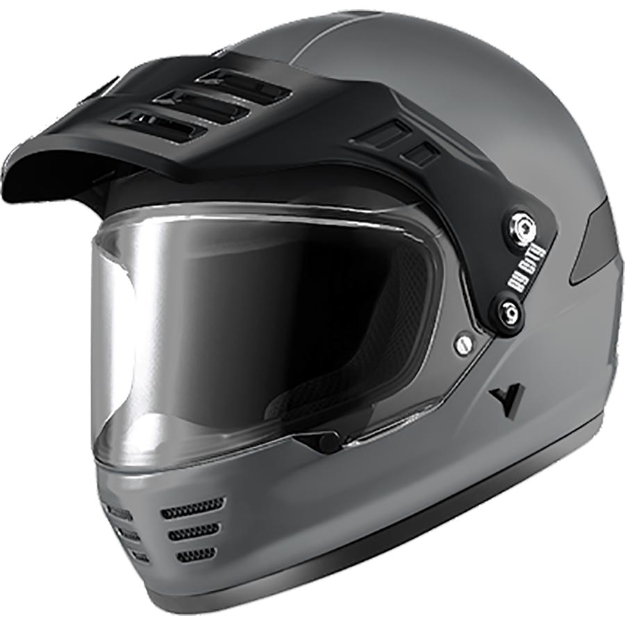 A retro adventure style full face helmet made of fibreglass, an early adopter retro style helmet to conform to the ECE R22.06 standard, with closable air vents on shell and chin bar, detachable peak included and option for a Pinlock.