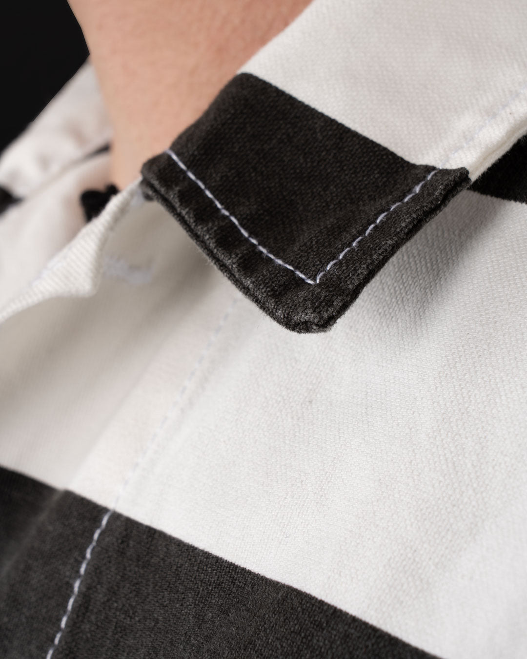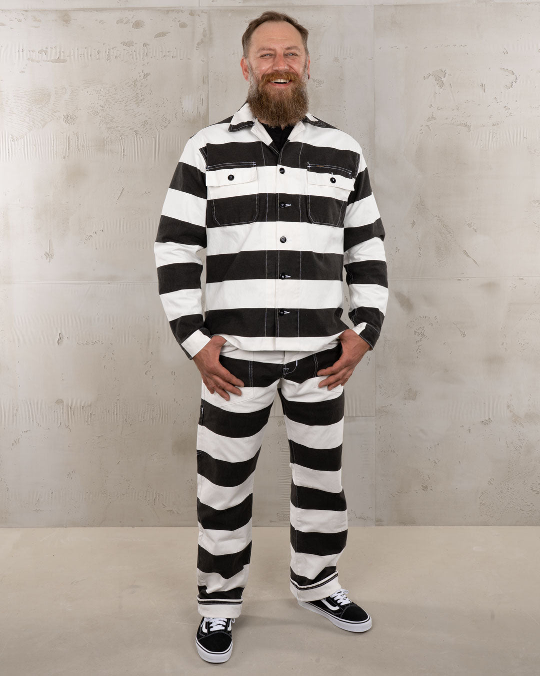 Made from 100% cotton printed canvas, the fabric features stripes reminiscent of 19th-century prison uniforms, making a bold statement that cannot be ignored. This version pays tribute to both the original shirt's practicality and the provocative symbolism of the striped design. The result is a shirt that embodies ruggedness, function, and unapologetic boldness.
